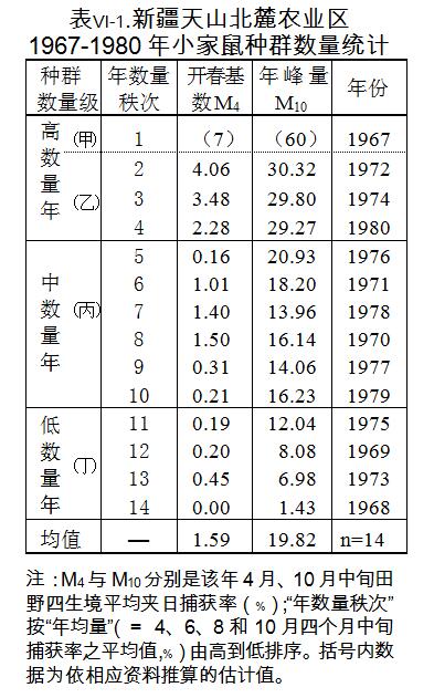 鼠種群暴發(fā),既須自身生理興旺,還需外界條件相助。通過1967-1980年天山北麓農(nóng)業(yè)區(qū)現(xiàn)場觀察,結(jié)合數(shù)理統(tǒng)計(jì)分析,查出有利北疆小家鼠暴發(fā)的4項(xiàng)主要外部因子:冬雪厚、春溫高、夏日和(日較差偏小、降雨偏少)與秋糧豐。北疆氣候大陸性極強(qiáng),干旱多風(fēng),溫度變化激烈,日較差、年較差及年際變化都很大,冬嚴(yán)寒,夏酷暑。小家鼠個(gè)體小而保溫耐力差、不善挖掘而巢居簡陋、繁殖力強(qiáng)而易起伏、對環(huán)境突變的抵御能力薄弱,這就使它們對氣侯特別敏感。冬雪、春溫、夏日波動(dòng)狀況,就成為制約鼠生存與增殖的3個(gè)主要外源性因素;全年氣候綜合一起則影響農(nóng)業(yè)年成,秋糧豐歉及收割狀況更關(guān)系著鼠的食物(尤其是越冬營養(yǎng))條件,是生死悠關(guān)的另一方面外源性調(diào)節(jié)因素。當(dāng)鼠種群處于上升態(tài),這4個(gè)有利環(huán)境條件綜合出現(xiàn),就能促發(fā)和支持其數(shù)量激增,故稱為“四友”。
