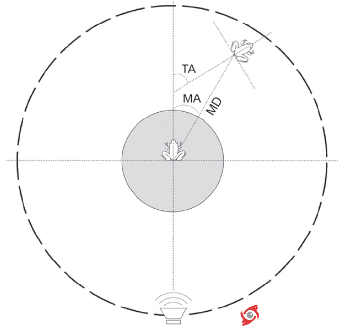 圖2. 仙琴蛙耳偏側(cè)性實(shí)驗(yàn),播放雄蛙的求偶鳴叫時(shí)雌蛙會(huì)轉(zhuǎn)身朝右跳,播放求救鳴叫時(shí)則會(huì)轉(zhuǎn)身朝左跳(圖片來(lái)自文獻(xiàn)Xue et al. 2015)