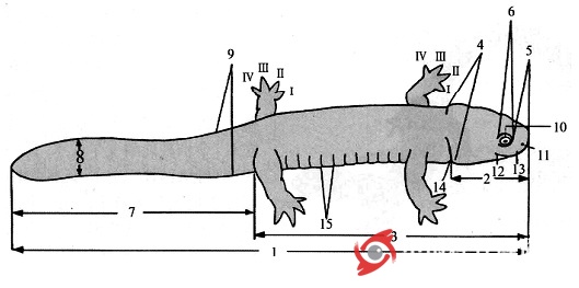1.全長(自吻端至尾末端),2.頭長(自吻端至頸褶),3.頭體長(自吻端至肛孔后緣),4.頭寬(左右頸褶間最寬處),5.吻長(自吻端至眼前角),6.眼徑(與體軸平行的眼的長),7 尾長(自肛孔后緣至尾末端),8.尾高(尾部的最大高度),9.尾寬(尾基部的最大寬度),10.上眼瞼,11.鼻孔,12.口裂,13.唇褶,14 頸褶,15.肋溝。 、 、 、 分別表示指和趾的順序。其中3、7、13、15是比較主要的特征。