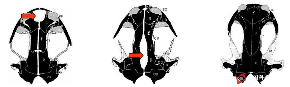 圖4.囟門的示意圖。從左到右依次為爪鯢Onychodactylus fischeri,極北鯢Salamandrella keyserlingii,商城肥鯢Pachyhynobius shangchengensis