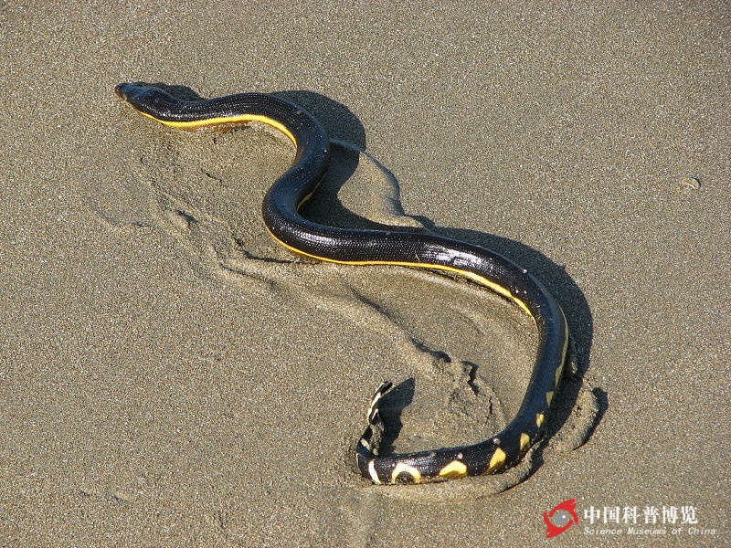yellow-bellied?sea?snake,是亞洲眼鏡蛇和澳大利亞虎蛇的后代,它的出現(xiàn)是伴隨著ElNi?o(厄爾尼諾)現(xiàn)象而來的,在水中和陸地都能生存,毒性極強。