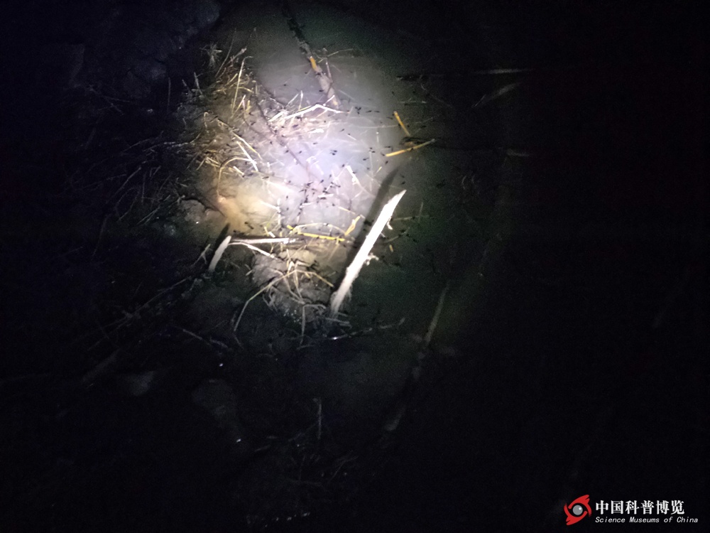 就在這時,我們遇到了一個意料之外的問題,我們的手電筒沒電了。其中一個很不給力地熄滅了,頓時眼前一片漆黑,眼看就不能繼續(xù)找下去。這時,從對面走來了一群正往家走的村民,大概有6~7位,更重要的是他們手里有手電??赡芩麄円埠芎闷鎯蓚€陌生人在這里,其中一個小伙主動過來問我們有沒有需要幫助的。我們把事情簡單介紹了一下。那幾位村民表示他們知道哪里有成年的個體,于是就用他們的手電,帶著我們穿越農(nóng)田到里邊更大的水坑里。果然我們觀察到了正在抱對的中華蟾蜍(