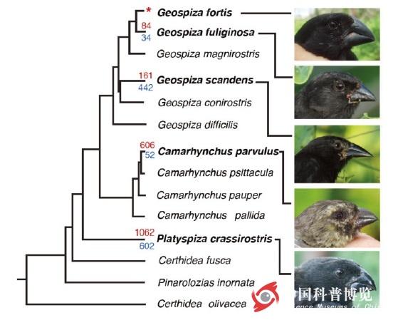 圖2 被選擇的達爾文雀和它們之間的進化關(guān)系(圖片來自Skinner et al. 2014)