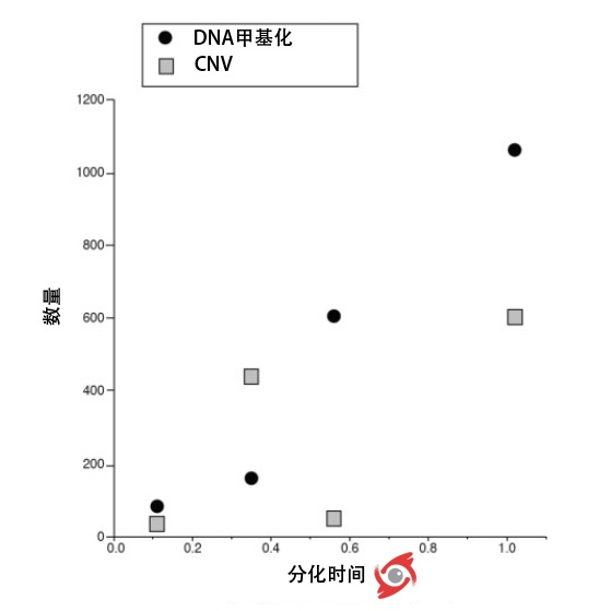 圖3 DNA甲基化和CNV隨物種分化時間的積累(圖片來自Skinner et al. 2014)
