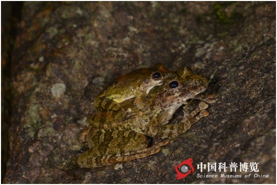 圖10.雌雄海南溪樹蛙抱對,身上的紋路跟石壁上的花紋神似