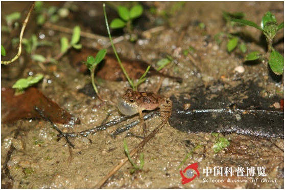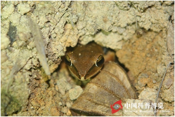 圖3. 偶然發(fā)現(xiàn)一只雄性斑腿泛樹蛙躲在洞中鳴叫