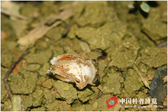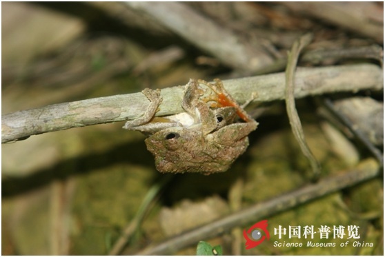 圖21.一只雄性鋸腿樹蛙眼睛微閉,四肢收攏,一動不動,它在裝死