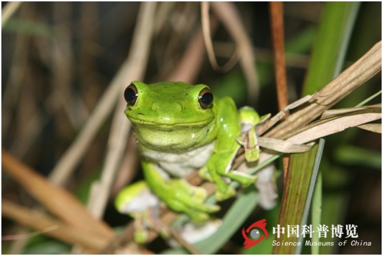 圖15.紅蹼樹蛙站在芒草枝上鳴叫,“噠噠噠”的叫聲很像在吹泡泡