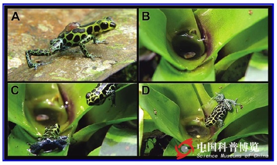 圖4. 箭毒蛙父親正在將孵化的蝌蚪運往鳳梨科植物頂端的小水洼