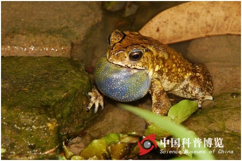 圖1. 示飾紋姬蛙的聲囊,鼓起的聲囊呈灰棕色