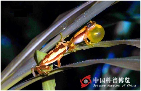 聲囊通過降低體腔與環(huán)境的阻抗失調(diào)使聲音能量損失達(dá)到最少,增加鳴叫率并使聲音朝大范圍角度傳播,這是聲囊的聲音信號(hào)功能。然而當(dāng)時(shí)科學(xué)家并沒有認(rèn)識(shí)到不斷伸縮的聲囊也是一種重要的視覺信號(hào)。