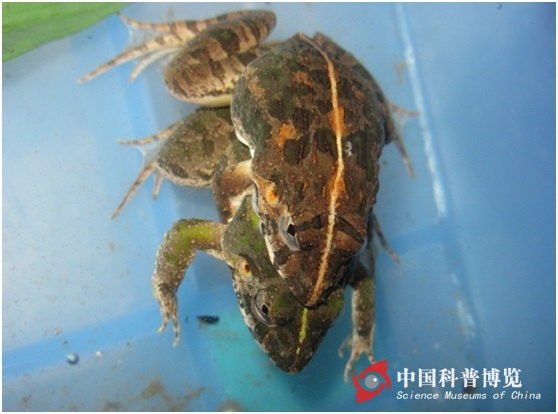 圖2. 兩只雄性澤蛙在抱對(duì),被抱的雄蛙并沒有反抗(圖片來源:作者本人攝影)