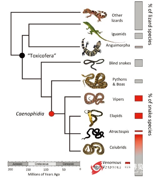 圖1. 蟒蛇和有毒蛇在進化樹上的分布
