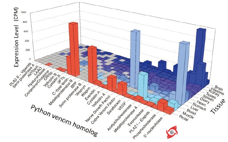 研究人員選擇了20多個毒素基因家族,測定了它們在蟒蛇12個器官中的表達模式。結果發(fā)現,蟒蛇中的蛇毒同源基因在多個不同的器官中都有表達,而不僅是口腔的腺體之中。蛇毒同源基因在蟒蛇中的表達量普遍比較低,但也有個別表達比較高。