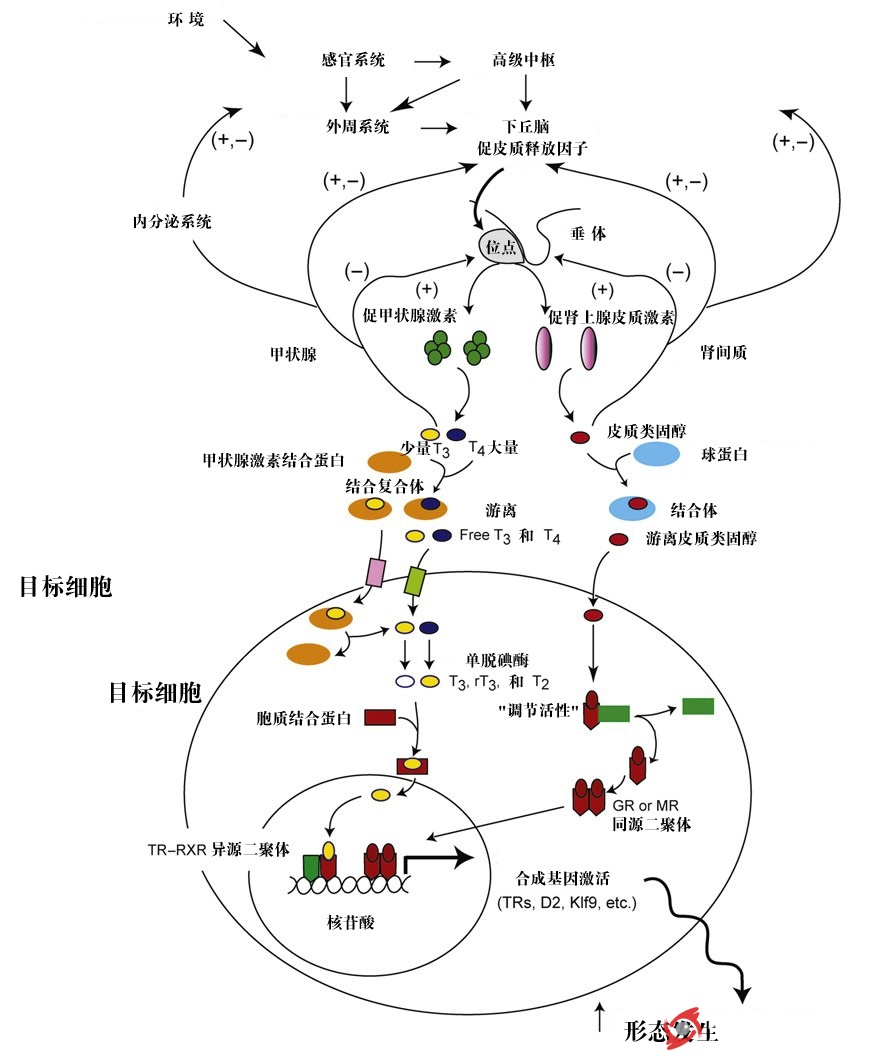 兩棲動物的變態(tài)是由蝌蚪的發(fā)育程度、個體的大小和條件以及環(huán)境信號互相影響的,而這些過程和信號是由神經內分泌系統(tǒng)整合來調控甲狀腺產生的激素。在變態(tài)過程中,甲狀腺激素是最主要控制形態(tài)形成的因素,同時也和類固醇(由腎間腺體產生)協(xié)同促進變態(tài)的發(fā)生。單脫碘酶在甲狀腺目標組織中的表達來調控甲狀腺的活性。敏化組織的類固醇對甲狀腺激素的活性起作用是通過上調甲狀腺受體和單脫碘酶。單脫碘酶在脊椎動物中存在三種形式( I, II, III),而在蝌蚪中只檢測到第二種(II)和第三種(III)形式,在成體青蛙中可以檢測到單脫碘酶(I)。單脫碘酶(II)和單脫碘酶(III)有著組織特異性和發(fā)育階段特異性,它們利用推拉的機制來調節(jié)T3的濃度。整個變態(tài)過程中甲狀腺活性是受下丘腦和腦垂體控制的,下丘腦-腦垂體-甲狀腺和下丘腦-腦垂體-腎間質這兩條軸是在多水平上手調控。下丘腦的促皮質激素釋放因子是一個核心且共有的調控者,它調控著蝌蚪腦垂體中促甲狀腺激素和促腎上腺皮質激素的分泌,因此它也調控著甲狀腺激素和類固醇,具體的神經內分泌系統(tǒng)調控兩棲動物的變態(tài)過程見圖2。