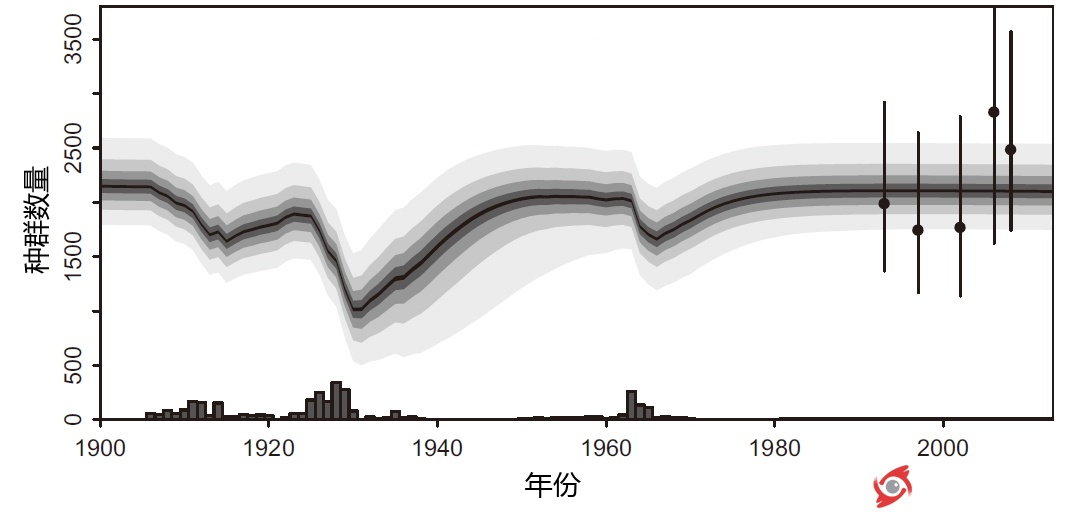 圖3. 種群動(dòng)態(tài)分析發(fā)現(xiàn)種群數(shù)量已經(jīng)趨于飽和(條形圖為藍(lán)鯨的非自然死亡數(shù)量;點(diǎn)圖為預(yù)測點(diǎn);圖片來自Monnahan et al. 2014)