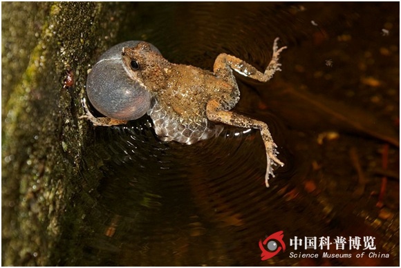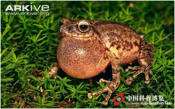 圖1. 查爾斯灌木蛙Raorchestes charius展示其單咽下外聲囊。Sachin Rai攝,自ARKive