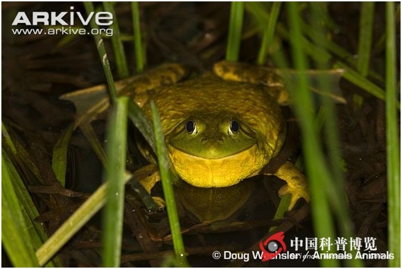 圖2. 美洲牛蛙通過腹腔和單咽下外聲囊產(chǎn)生低沉的共鳴叫聲。Doug Wechsler攝,自ARKive