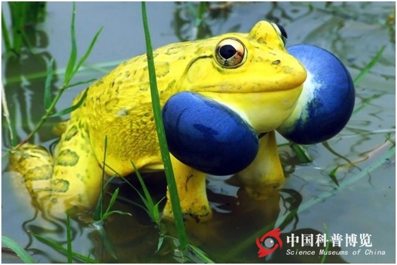圖3. 印度虎紋蛙示其藍色雙咽下外聲囊。圖片源自bluanimalbio