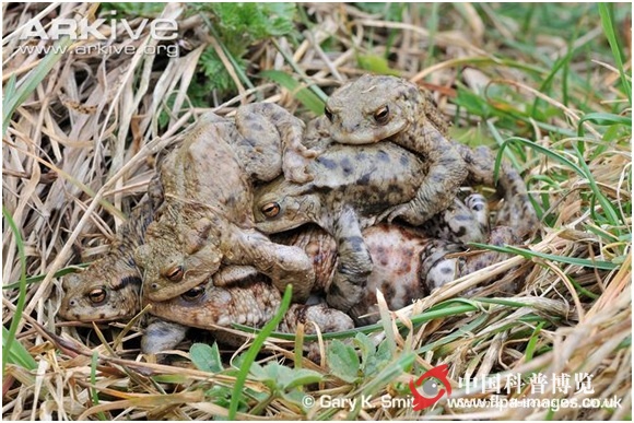 圖7. 蟾蜍Bufo bufo的交配球 。最下方體型最大的為雌性,其余為抱對雄性, 被錯抓的雄性會發(fā)出釋放鳴叫。Gary K. Smith攝,自ARKive