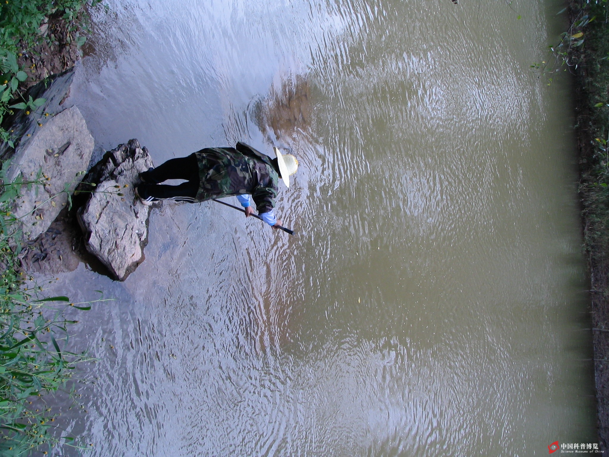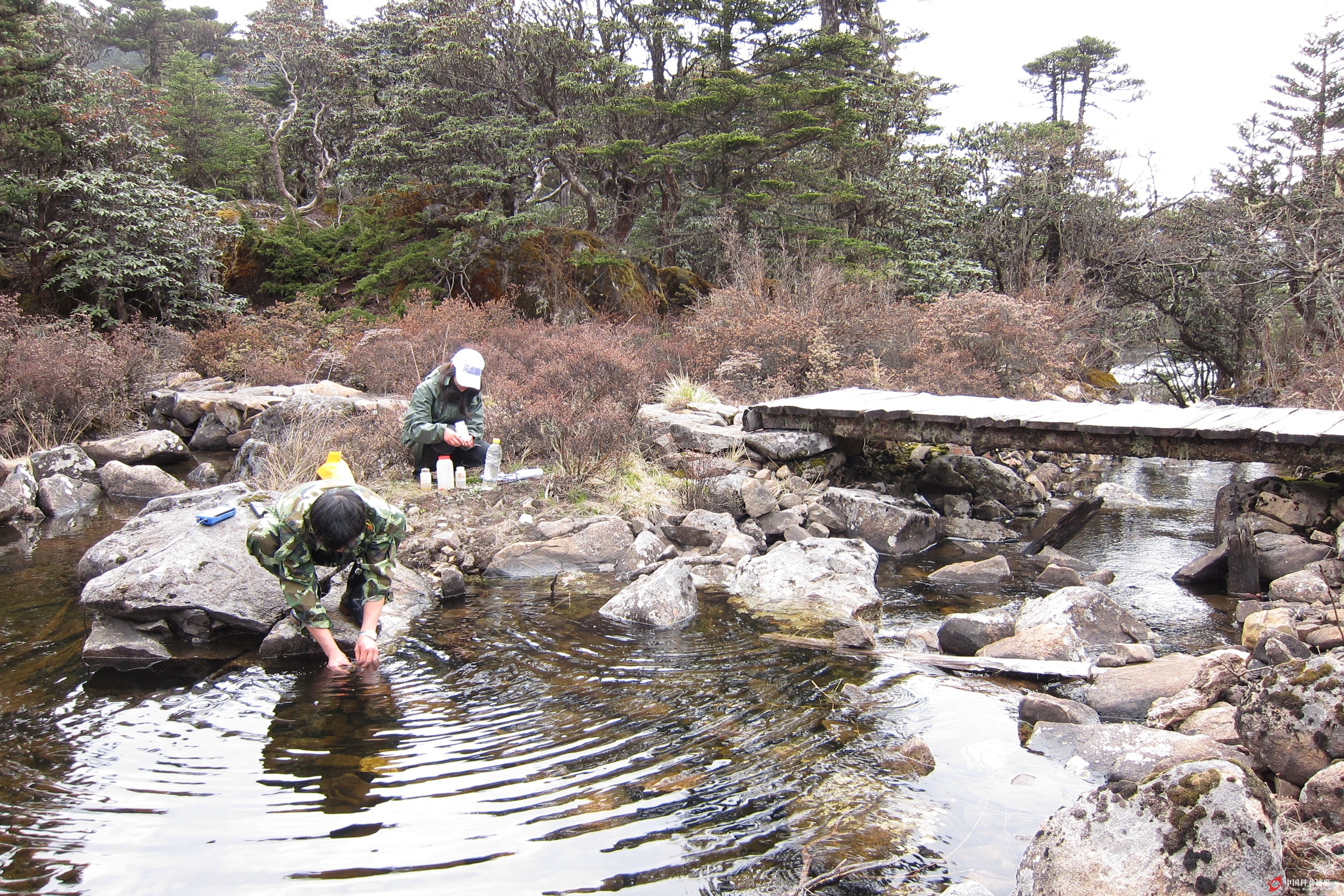 圖2. 兩棲動物野外考察自然也離不開“水”(云南,此湖名天才湖,出口處生活著大量的齒突蟾物種Scutiger sp.)