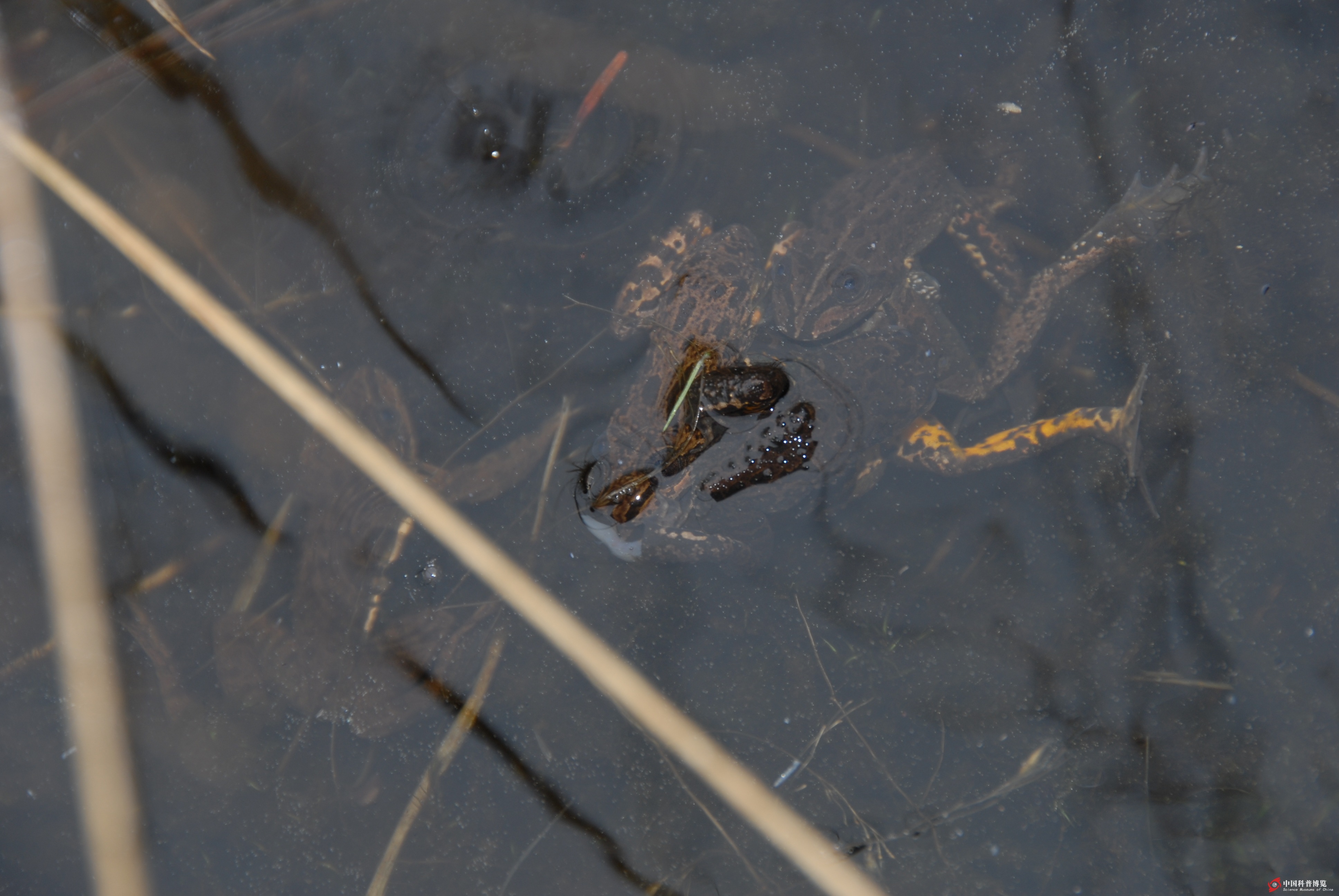 圖10. 高原湖泊集中抱對繁殖的倭蛙Nanorana ventripunctata(此水域的腹斑倭蛙抱對繁殖,相互爭奪抱對雌性,競爭非常激烈;圖中有6只)