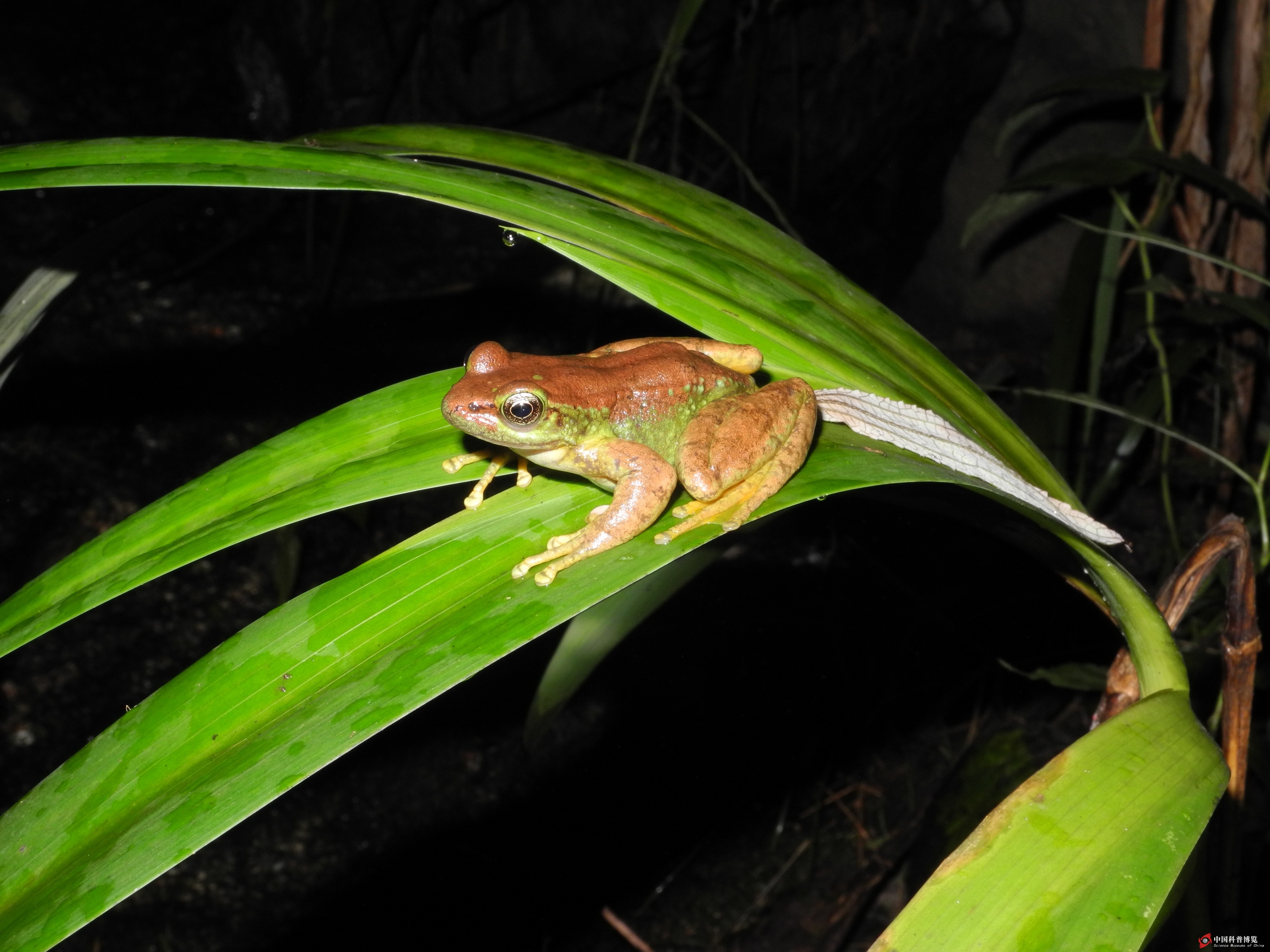 圖12. 蹲坐在扁竹根葉上的四川湍蛙Amolops mantzorum( ,湍蛙頭面向急流水面)