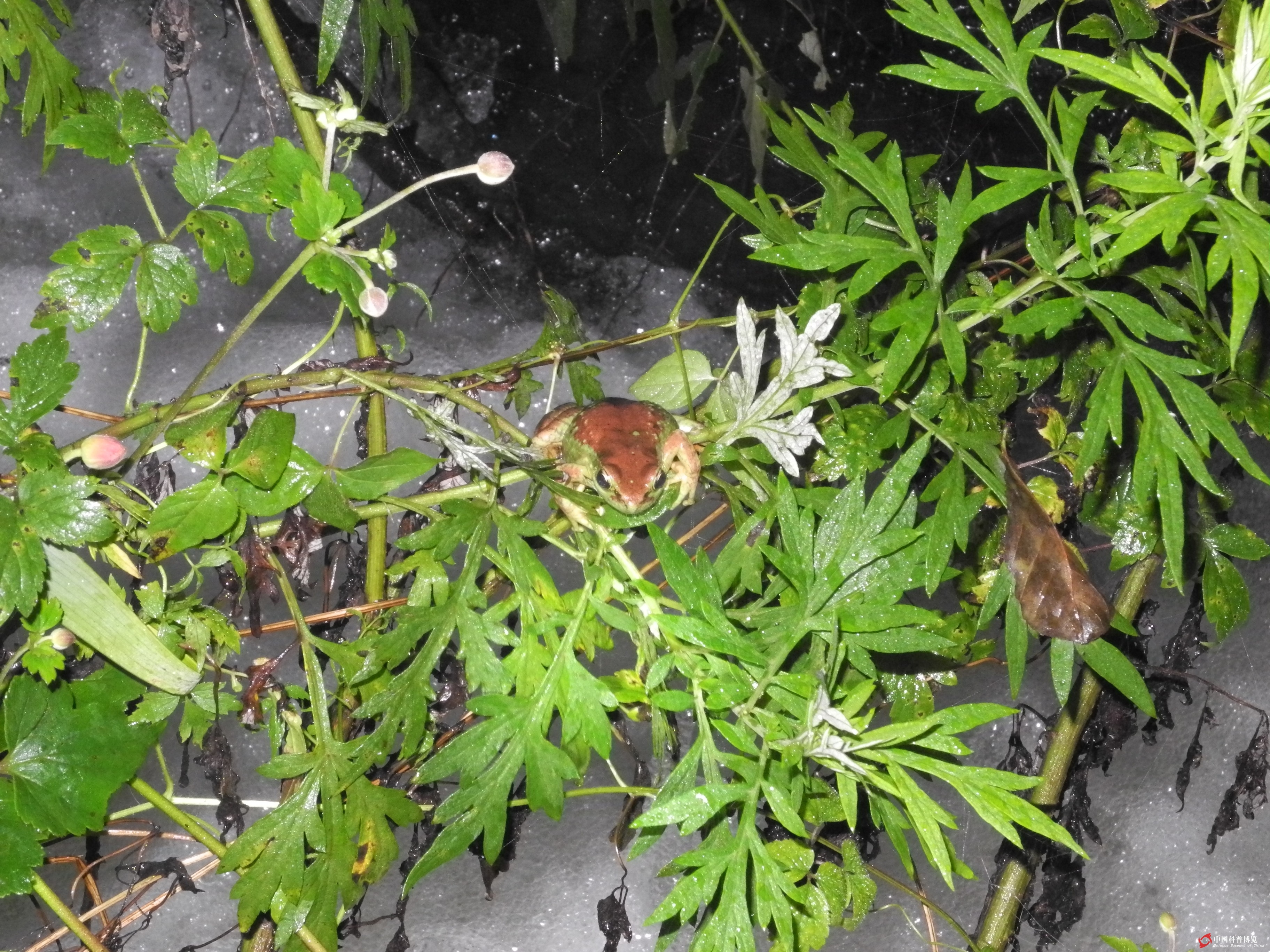 圖13. 湍急河流上方的四川湍蛙Amolops mantzorum( ,湍蛙抓握在蒿草枝條上;白色泡沫是水流沖出而成)
