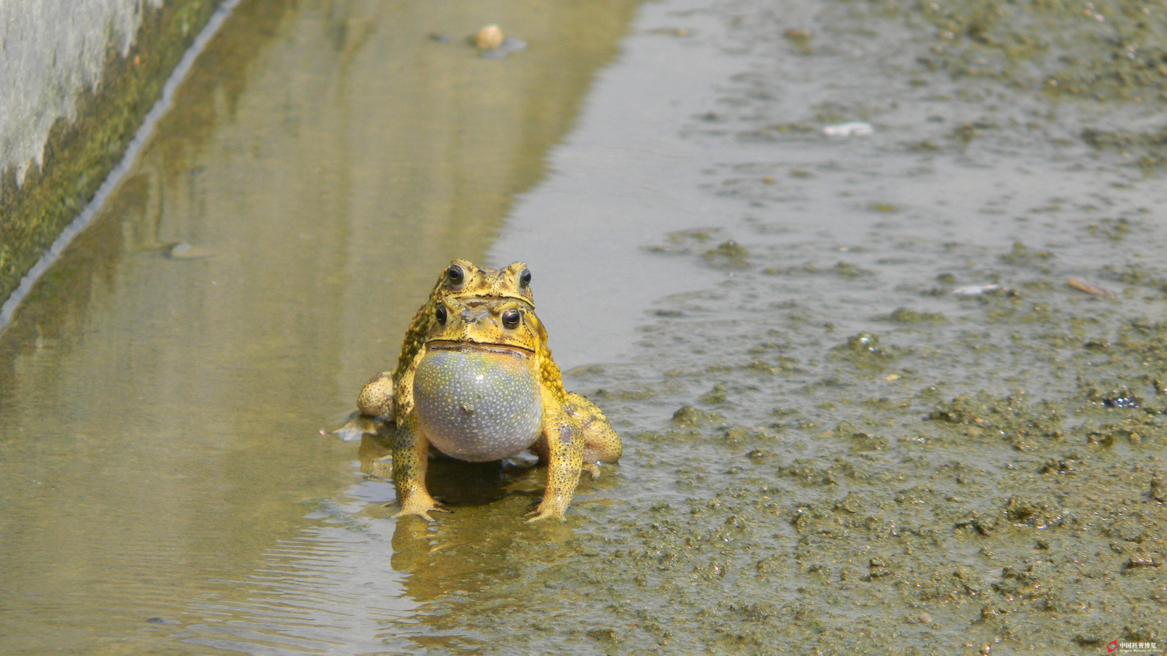 圖5. 黑眶蟾蜍Bufo melanostictus(貴州),白天發(fā)現(xiàn)于一水渠中,正在進(jìn)行生殖季節(jié)例行的鳴叫和抱對(羅偉雄攝)