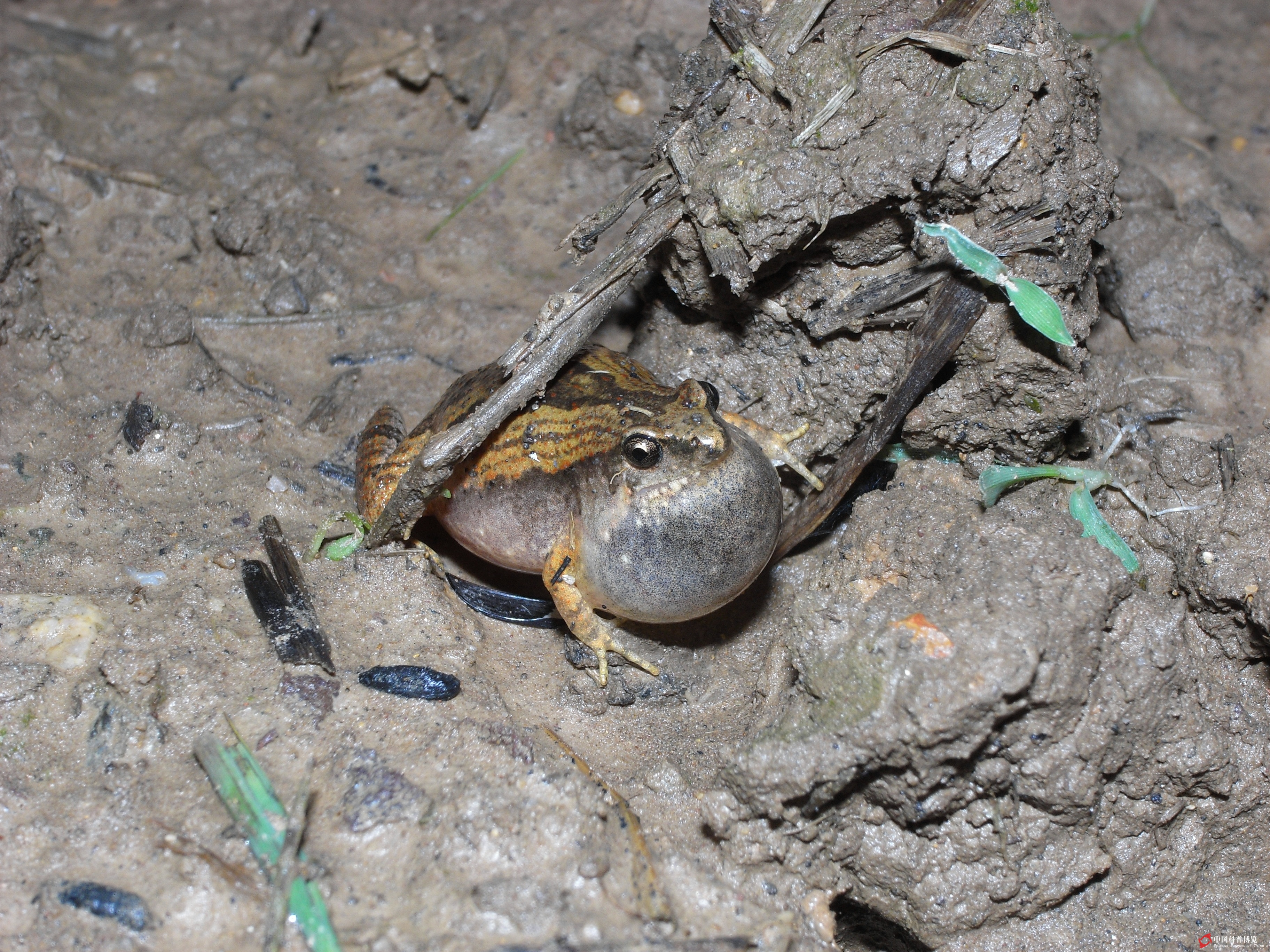 圖6. 水坑里鳴叫的飾紋姬蛙Microhyla ornata(大圍山)