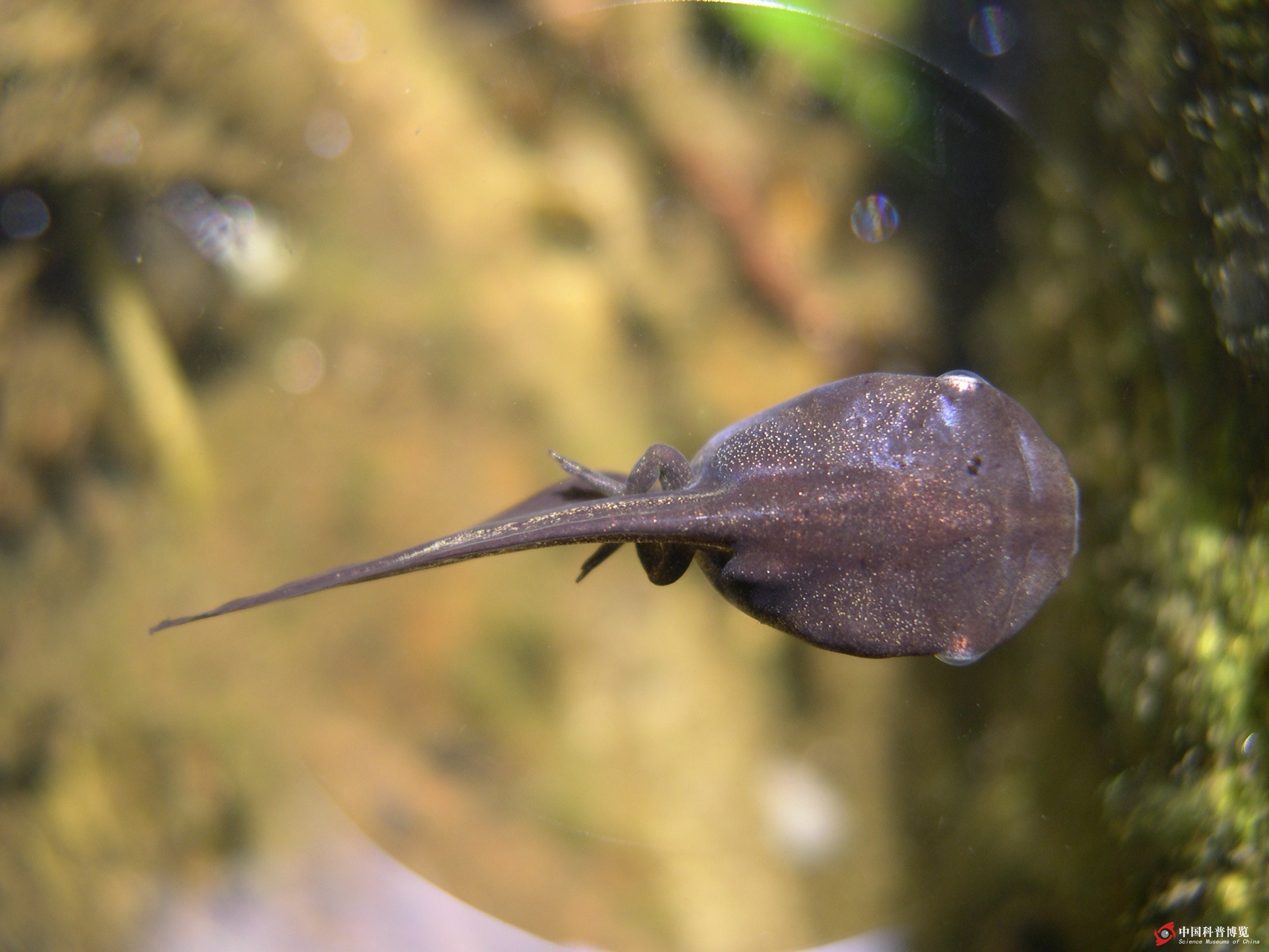 圖1. 大多數(shù)兩棲動物都生活在與水有關(guān)的環(huán)境中(云南,所站石頭左側(cè)生活著有后肢的蝌蚪)