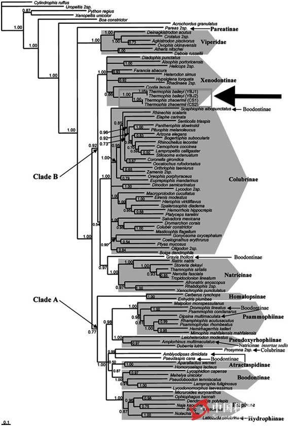 圖7. 蛇類進化樹,黑色粗箭頭所指為溫泉蛇屬。自Huang et. al 2009.
