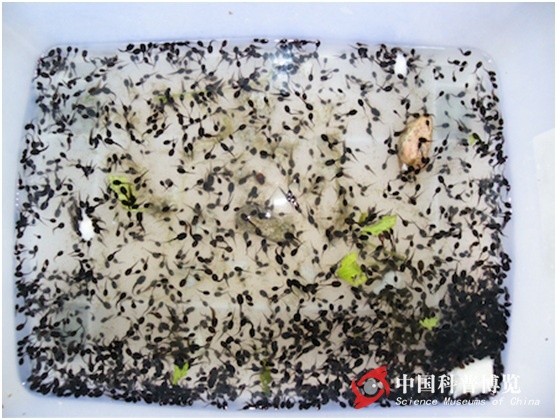 圖3. 2009.6.20一個(gè)多月后,長(zhǎng)大的蝌蚪正在爭(zhēng)先恐后地?fù)屖常ú巳~和饅頭)