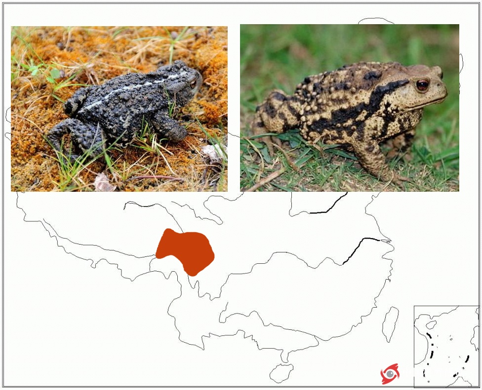 圖1. 西藏蟾蜍和它們的分布區(qū)域(左圖為西藏蟾蜍,右圖為中華蟾蜍,橘紅色為西藏蟾蜍的分布范圍)