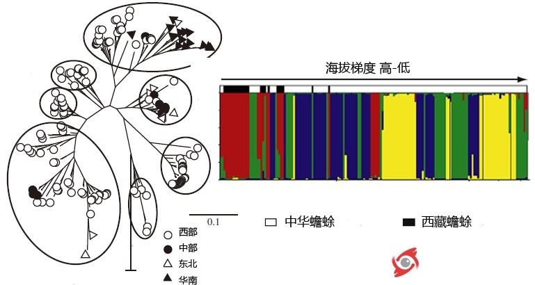 圖3. 進(jìn)化關(guān)系重建和個(gè)體聚類均表明西藏蟾蜍和中華蟾蜍沒有明顯區(qū)分