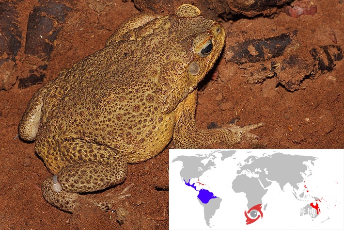 圖1. 海蟾蜍及其分布范圍(藍(lán)色為原棲息地,紅色如人為引入棲息地)