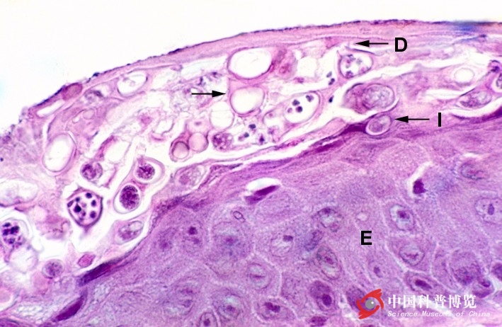 從上至下D為正在釋放孢子的孢子囊(上部乳頭狀突起為釋放口,孢子囊內(nèi)紫色圓點(diǎn)為游走孢子), 箭頭所指為釋放后的空孢子囊, I為為發(fā)育成熟的孢子囊,E為寄住的上皮組織(圖片摘自加州伯克利大學(xué)AmphibianWeb)