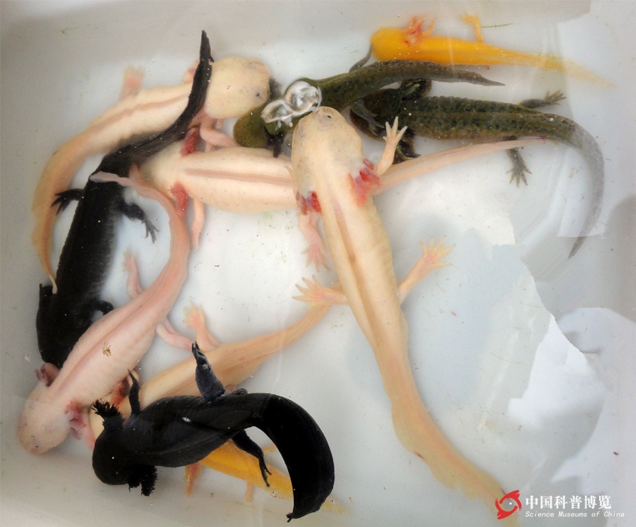 由于墨西哥鈍口螈的卵大、數(shù)量多,容易繁殖,而且具備一定的組織再生能力,現(xiàn)在已經(jīng)成了科學研究的模式生物,在實驗室中廣泛養(yǎng)殖并用于器官再生等方面的研究。由于有金色、白色、粉紅、橙黃、黑色、虎斑等色彩變異,飼養(yǎng)環(huán)境和金魚類似,而且對人沒有毒性,墨西哥鈍口螈成了當前世界流行的兩棲類寵物,目前已有三十多個品種出現(xiàn)(圖二)。