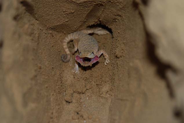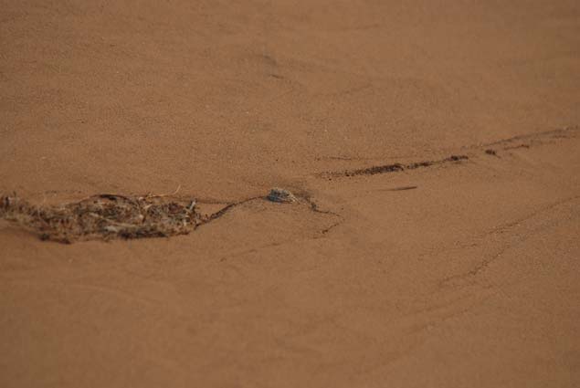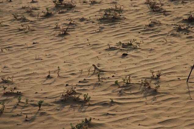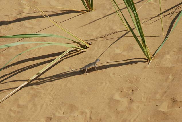 我們?cè)诓贿h(yuǎn)處一片沙漠發(fā)現(xiàn)了一種很特別的蜥蜴——大耳沙蜥。它個(gè)頭大、鼻孔朝天、胖乎乎的,腳趾上長(zhǎng)著毛一般的鱗片,方便其在沙粒上奔跑。這小東西發(fā)怒時(shí),會(huì)張開腮幫子,就像兩只大耳朵——那可真是“嘴巴咧到耳后根”。滾燙沙漠的地面溫度早已超過五十度,但這絲毫不影響大耳沙蜥的活躍。它們的行為也很特別,外出活動(dòng)時(shí)不喜歡草叢,只喜歡沙地,發(fā)現(xiàn)了危險(xiǎn),就踮著腳急速奔跑,然后突然停下回頭探看敵情。一旦離開天敵視線,它就晃晃身子,迅速藏進(jìn)沙堆里一動(dòng)不動(dòng)。有時(shí)候隱藏得不好,會(huì)露出尾巴,甚至還露出腦袋——搞笑的是,它還以為自己隱藏很好,繼續(xù)一動(dòng)不動(dòng)。而如果奔逃和躲藏都沒能擺脫敵人,它就會(huì)突然轉(zhuǎn)過身,張開大嘴進(jìn)行恐嚇。