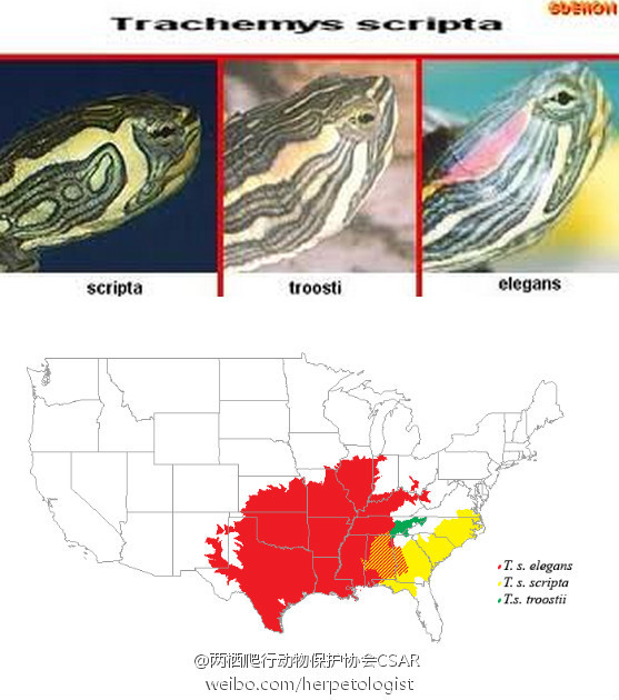 紅耳龜Trachemys scripta elegans(圖三中紅色)只是彩龜Trachemys scripta的一個(gè)亞種。其他兩個(gè)亞種是黃腹彩龜Trachemys scripta scripta(圖三中黃色)和坎伯蘭彩龜Trachemys scripta troostii(圖三中綠色) 。紅耳龜?shù)脑厥敲绹湍鞲纾辉诎臀?,目前是全球危險(xiǎn)外來入侵種之一http://t.cn/zHqeG8I
