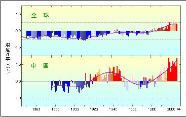 20世紀(jì)中國氣候變化趨勢(shì)與全球變暖的總趨勢(shì)基本一致。近百年來觀測(cè)到的平均氣溫已經(jīng)上升了0.5 ~0.8 ,略高于全球平均,其中最暖的時(shí)期出現(xiàn)在20世紀(jì)90年代,最明顯的地區(qū)是西北、華北和東北,長江以南地區(qū)變暖趨勢(shì)不明顯。與北極地區(qū)相同,我國在1925 至1945 年期間也觀測(cè)到一個(gè)較長的暖期(圖3)。預(yù)計(jì)到2100年,全國平均氣溫將升高3.9 ~6.0 。