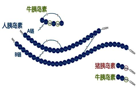 而最初上市臨床使用的胰島素幾乎都是從豬或牛胰臟中提取的。不同動物的胰島素組成均有所差異,豬胰島素與人胰島素的差別很小,只是在B鏈末端差了一個氨基酸,豬胰島素是丙氨酸,而人的胰島素是蘇氨酸。牛胰島素與人胰島素相差三個氨基酸,除了B鏈末端,在A鏈中還相差兩個氨基酸。