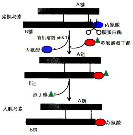 后來,人們發(fā)現(xiàn)在pH為6-7的有機相中使用胰蛋白酶催化,在過量的蘇氨酸叔丁酯的存在下,可以將豬胰島素B鏈C末端的丙氨酸替換下來,形成的人胰島素叔丁酯再用三氯乙酸脫去叔丁酯基團,最終獲得人胰島素,該過程的總轉(zhuǎn)化率為60%。這種方法使得豬胰島素改造成為人胰島素更加簡便,生產(chǎn)成本更加低廉,使得豬胰島素改造成人胰島素在臨床上治療糖尿病成為現(xiàn)實。