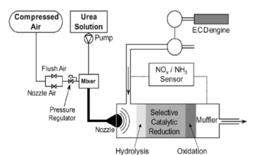柴油車的SCR系統(tǒng)由于涉及到還原劑尿素溶液隨運(yùn)行工況噴射,從而形成了一個(gè)復(fù)雜的系統(tǒng),如圖3所示。這一系統(tǒng)包括尿素溶液的供給和噴射,催化劑,傳感器等。SCR催化劑早期使用的是由火電廠脫硝的釩基催化劑,由于其毒性和耐高溫性能差,不能與CDPF匹配使用,現(xiàn)在在發(fā)達(dá)國家中已被停止使用,主流催化劑為負(fù)載Cu或Fe的分子篩催化劑,此外,復(fù)合氧化物催化劑也正在發(fā)展中。