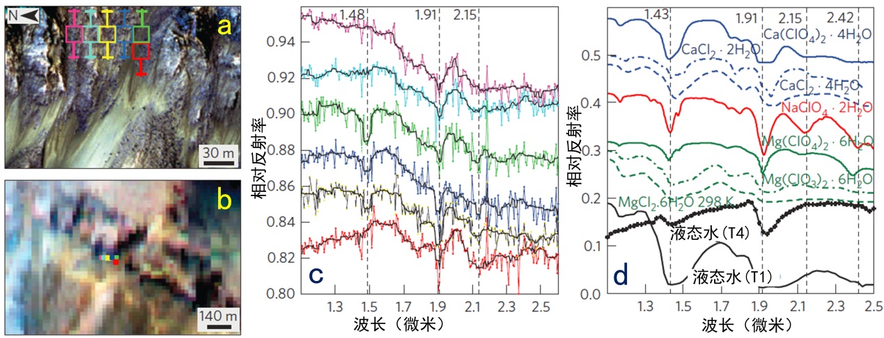 上圖中,a和b中的彩色方框為光譜測量的區(qū)域;c為光譜測量結(jié)果,不同顏色的譜線分別對應(yīng)于a和b圖中不同的測量區(qū)域。d為地面實驗室內(nèi)測得的各種含水鹽類化合物的譜線。