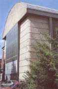 透平機(jī)(turbine,即渦輪機(jī))工廠的主要車間位于街道轉(zhuǎn)角處,主跨采用大型門式鋼架,鋼架頂部呈多邊形,側(cè)柱自上而下逐漸收縮,到地面上形成鉸接點。在沿街立面上,鋼柱與鉸接點坦然暴露出來,柱間為大面積的玻璃窗,劃分成簡單的方格。屋頂上開有玻璃天窗,車間有良好的采光和通風(fēng)。外觀體現(xiàn)工廠車間的性格。在街道轉(zhuǎn)角處的車間端頭,貝倫斯作了特別的處理,廠房角部加上磚石砌筑的角墩,墻體稍向后仰,并有“鏈墩式”的凹槽,顯示敦厚穩(wěn)固的形象,上部是弓形山墻,中間是大玻璃窗,這些處理給這個車間建筑加上了古典的紀(jì)念性的品格。