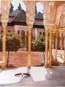 西班牙格蘭納達的阿爾罕布拉宮,是伊斯蘭世界中保存得比較好的一所宮殿。它位于一個地勢險要的小山上,有一圈3500米長的紅石圍墻蜿蜒于濃蔭之中,沿墻聳立著高高低低的方塔。圍墻的大門叫公正門,在南邊,君主在這里審理訴訟。宮殿偏于北面,它以兩個互相垂直的長方形院子為中心,南北向的叫石榴院,以朝覲儀式為主,比較肅穆。東西向的叫獅子院,比較奢華,是后妃們住的地方。