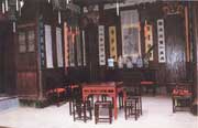 正對中門的前廳橫梁上,雕有一幅“宴官圖”,展示一群京城高官顯貴,在花園中宴酒作樂的情景;“宴官圖”兩邊的額坊上,雕了“元寶”與“金鉤釣魚”圖;中門上方閣樓護板上,有“漁、樵、耕、讀”四根木雕立柱,下面是“南北財神”,再稍下,四塊斗拱上雕了四出《三國演義戲文》;中門上方面臨廳堂的正中處雕有“百子鬧元霄”圖。別出心裁的是,中門兩側(cè)的邊門上方,雕了兩個“商”字形圖案,從邊門出入的人,都必須從“商”字下邊走過。