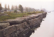 古纖道路基,是用石條砌成的一個個石墩,高出水面0.5米左右。墩與墩之間,用三塊長約3米、寬約0.5米的石板平鋪而成。