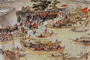 唐時(shí),由于城內(nèi)河道密布,橋也特別多,在白居易和劉禹錫作蘇州刺史時(shí),蘇州橋數(shù)在390座和370座之間。城門則有水陸各8座,每面各有2座,至今城西南角盤門尚留水、陸城門遺址。白居易詩(shī):“遠(yuǎn)近高低寺間出,東西南北橋相望。水道脈分棹鱗次,里閭棋布城冊(cè)方!薄疤幪帢乔帮h吹管,家家門外泊舟舫! 描述了唐時(shí)這座水鄉(xiāng)城市的風(fēng)貌。南宋時(shí)蘇州稱平江,是經(jīng)濟(jì)上和軍事上都很重要的城市。